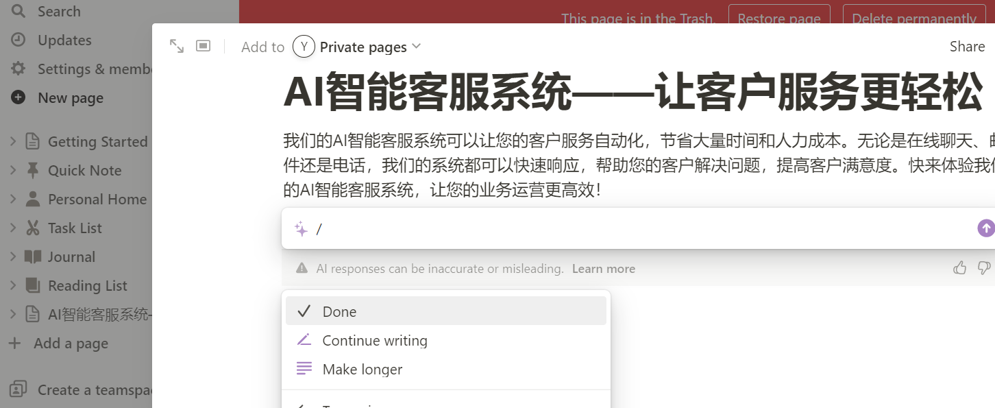 1、强大的 AI 写作能力:直接让 Notion AI 帮你写文章。